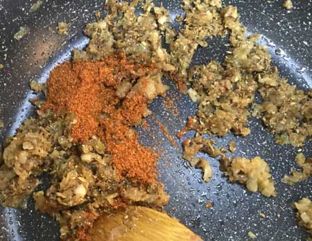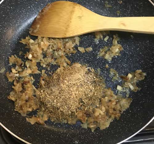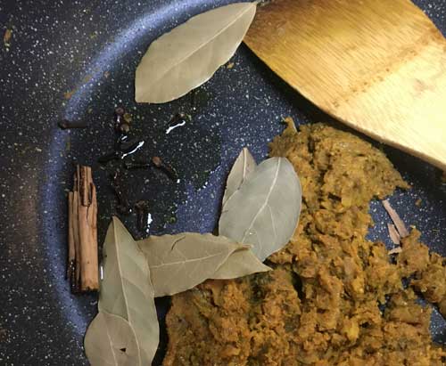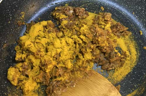 キッチンに戻り、フライパンの玉ねぎ、にんにく、生姜に